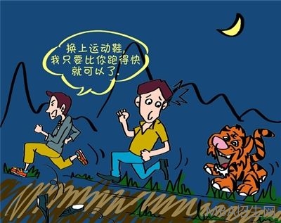 兩個(gè)人在森林里,遇到了一只大老虎。A趕緊從背后取下一雙更輕便的運(yùn)動(dòng)鞋換上。B急死了,罵道:“你干嘛呢,再換鞋也跑不過老虎啊!”A說:“我只要跑得比你快就好了。”