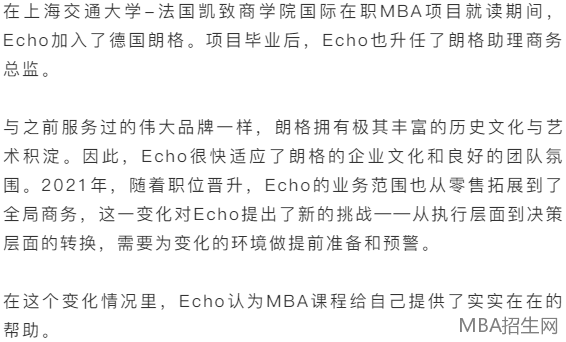 張佳蓉(Echo)對(duì)奢侈品行業(yè)的鐘情源自于她對(duì)文化和藝術(shù)審美的興趣與熱愛。十多年來,她深耕奢侈品行業(yè),曾服務(wù)于萬寶龍(屬歷峰集團(tuán))、迪奧、葆蝶家、歐米茄(屬Swatch集團(tuán))等多個(gè)奢侈品品牌。2018年,為了應(yīng)對(duì)可預(yù)期的職業(yè)瓶頸,Echo選擇報(bào)讀上海交通大學(xué)-法國凱致商學(xué)院國際在職MBA項(xiàng)目。伴隨著個(gè)人管理能力的全面提升,Echo的職業(yè)也掀開了新的篇章。2020年,Echo加入德國朗格,同年項(xiàng)目畢業(yè)后,升任朗格助理商務(wù)總監(jiān)。從執(zhí)行到?jīng)Q策,面對(duì)角色轉(zhuǎn)變帶來的挑戰(zhàn),Echo已經(jīng)做好了管理知識(shí)儲(chǔ)備、靈活商業(yè)思維和多方智囊資源的多重準(zhǔn)備。