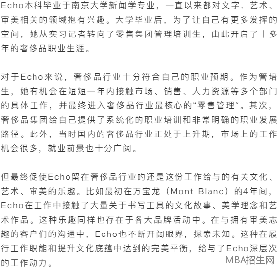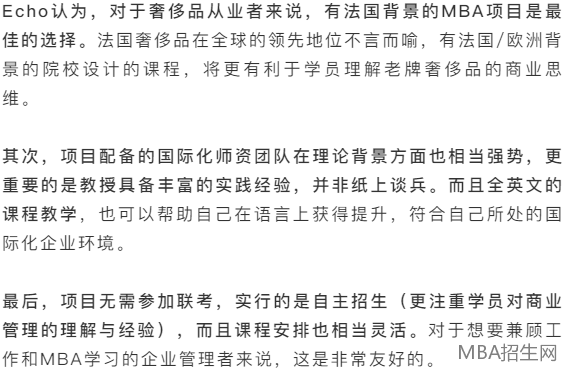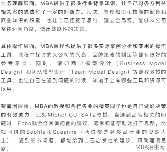 對(duì)于仍在猶豫報(bào)讀MBA的同學(xué),Echo的建議是正確評(píng)估自己的職業(yè)階段,選擇適合自己的項(xiàng)目。如果是奢侈品行業(yè)的職業(yè)經(jīng)理人,上海交通大學(xué)-法國凱致商學(xué)院國際在職MBA體驗(yàn)將會(huì)是一個(gè)不錯(cuò)的選擇。對(duì)于即將進(jìn)入這個(gè)MBA項(xiàng)目學(xué)習(xí)的學(xué)員,Echo的建議是全身心的投入和主動(dòng)學(xué)習(xí)。因?yàn)榻淌趥兊膶I(yè)度和學(xué)術(shù)性都很高,所有課程都需要較多的前期準(zhǔn)備、課堂的高度集中和之后的持續(xù)產(chǎn)出,對(duì)于需要兼顧工作的職業(yè)經(jīng)理人來說肯定強(qiáng)度不小,但深度參與后,就能感受到這種認(rèn)真態(tài)度帶來的高回報(bào),學(xué)到很多直接能用于工作的實(shí)踐工具,以及啟發(fā)性的方法論。