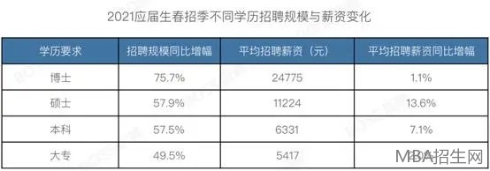 在表格中看到,其中碩士生招聘薪資漲幅較明顯。近幾年,MBA的報(bào)考熱度與日俱增,很多人報(bào)考MBA是看中了它的含金量,目的是希望能夠提升學(xué)歷的同時(shí)可以升職、加薪,在職場上走向人生巔峰。那到底MBA畢業(yè)生的就業(yè)趨勢和薪酬水平是怎樣的?讀完MBA工資究竟能漲多少錢呢?