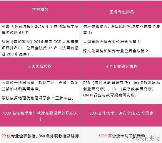 學校被歐洲管理基金會EFMD和美國國際管理教育聯(lián)合會AACSB、歐洲EQUIS, EPAS及BSIS認證,也是CGE法國大學校協(xié)會的成員,相當于中國的“211工程”,被中國與法國教育部同時認證,是歐洲領先的商業(yè)和管理學院之一。全世界Top-90商學院中,該校排名63,英國(《金融時報》2016年12月數(shù)據(jù))。GE大學校精英項目全法第15(《費加羅報》2016年度)。